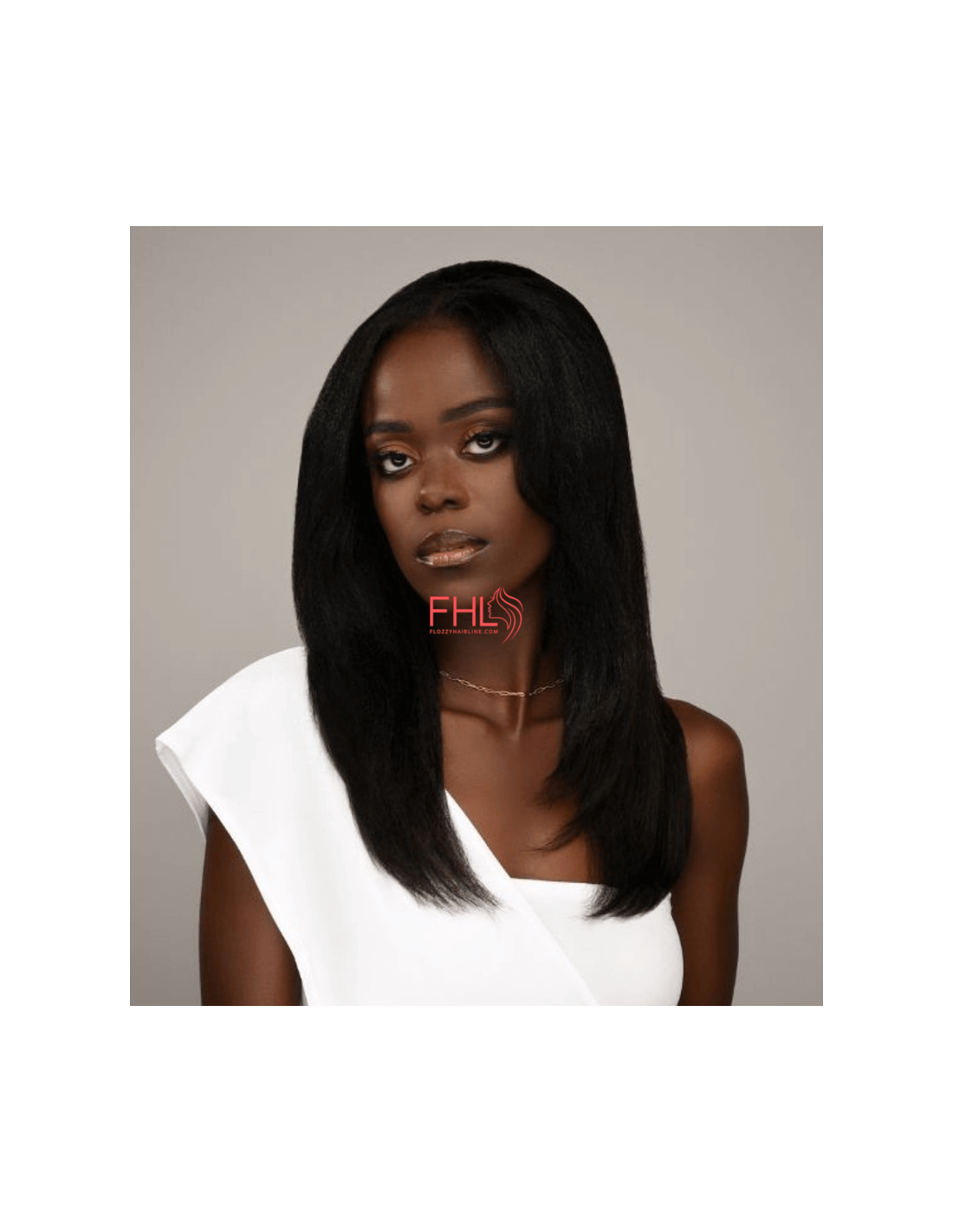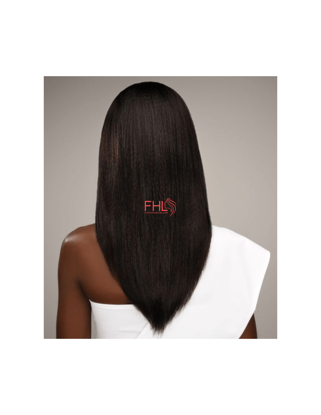 Mia est une coiffure humaine longue et droite à texture yaki, avec une coupe en V effilée à l'arrière et un look superposé sur le devant, elle se porte en postiche ou en demi perruque.
